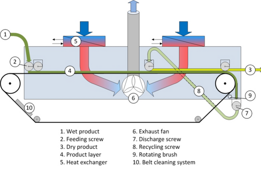 When drying biomass there are three types of driers available: Belt driers, drum driers and flash driers. Heat is produced from an external heat source such as a boiler powered by either pellets, green wood chips, dried sawdust, diesel or gas.